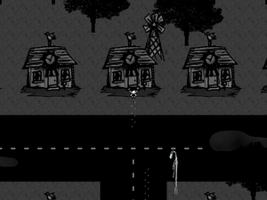 A bathtub and fridge can be found in the middle of the streets. Multiple extremely crudely drawn, animated deer are scattered throughout the area. They cannot be interacted with.